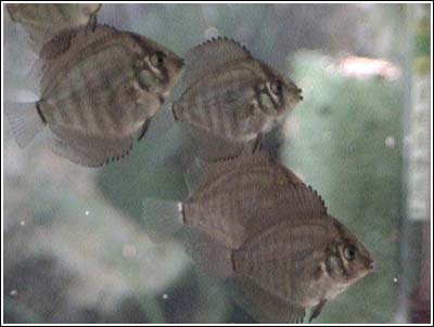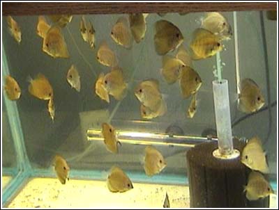 Photo 7: These fry are one month old and have been placed in an aquarium where they are fed 3 - 4 times a day. Their diet consists of flake food, live food (diced blackworms), ground beefheart mixes, Tetra ColorBits (ground), finely chopped bloodworms, and various spirulina based gel foods. ![]()