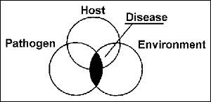 Resistance: An animal is able to adapt to stress for a finite period of time. During this period the animal may look and act normal, but is depleting energy reserves because of the extra requirements placed upon it (See Figure 1). Exhaustion: The animal's reserves have been depleted and adaptation fails because the stress was too severe or lasted too long (see Figure 1). What Is Disease? Disease is an abnormal condition characterized by a gradual degeneration of a fish's ability to maintain normal physiologic functions. The fish is not "in balance" with itself or its environment. Disease Resistance All fish do not get sick and die each time a disease outbreak occurs. There are many factors which affect how an individual responds to a potential pathogen. The pathogen (bacteria, parasite, or virus) must be capable of causing disease. The host (fish) must be in a susceptible state, and certain environmental conditions must be present for a disease outbreak to occur ( Figure 2 ).