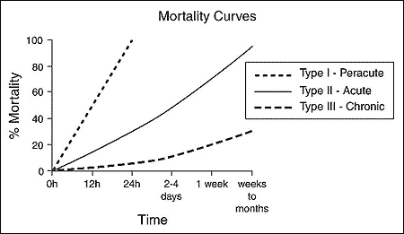 Figure 1: By graphing the percent mortality (number of dead fish/total number of fish in the population) over time, one can determine if affected fish are suffering from a peracute, acute, or chronic type pathogen. more ... |