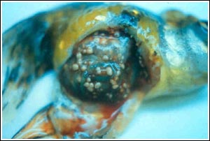 Figure 1 Granulomas (nodules) are readily visible on multiple organs in the abdominal cavity during necropsy. The disease in this fish was very advanced.