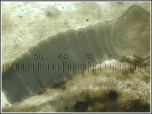 Figure 2: Photomicrograph of a tapeworm showing typical segmentation (scale in micrometers - tapeworms can be much longer than the one shown).