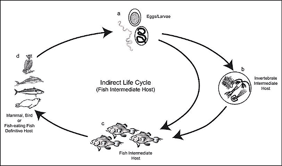 Figure 8: Indirect life cycle where the fish is an intermediate host. The nematode eggs/larvae (a) enter an invertebrate intermediate host (b) OR a fish intermediate host (c) prior to being eaten by or entering the final host, a fish-eating mammal, bird, or fish (d). Some nematodes have the ability to survive in "alternative" organisms, known as "paratenic" hosts. These hosts are not required for completion of the life cycle but they can contain infective nematode life stages and be a source of infection ( Figure 9 ). They can be fish, worms or other aquatic organisms that eat the nematode eggs or larvae.