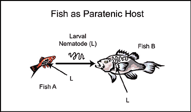 Figure 9: Paratenic host. Fish A contains a larval nematode (L). When Fish A is eaten by Fish B, larval nematode (L) migrates out of Fish A into Fish B's body. Fish B can be considered a paratenic host because it is not required for completion of the nematode life cycle, but can still serve as a host.