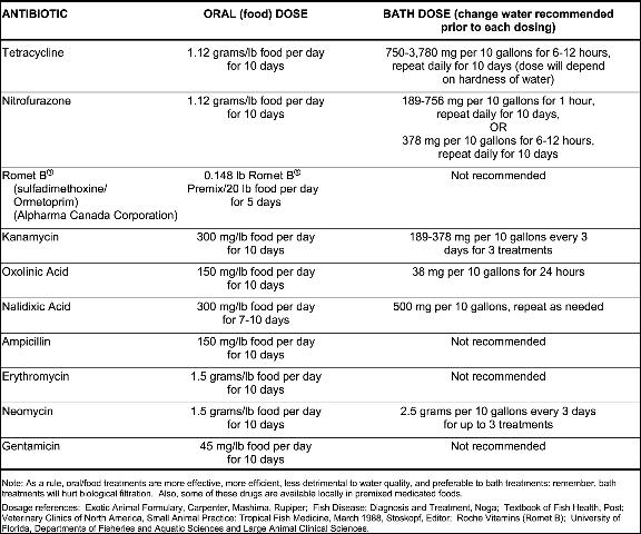 Although the pharmacokinetics of many antibiotics have not been scientifically determined for most species of fish (and especially not ornamental species), good estimations of the activity of many antibiotics have been determined from clinical experience and from work with food fish. Following such guidelines for dosages and their corresponding treatment intervals (e.g., Table 1 ) should yield good results. Table 1