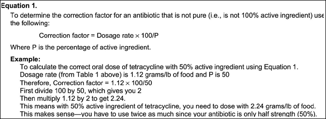 Many antibiotics commonly used for ornamental fish are sold by different companies; therefore, the percent of active ingredient will vary from product to product. This means that you may not have 100% of pure antibiotic required for disease control. You need to ask your supplier to provide you with the actual percentage of antibiotic that is active in the product you have purchased and calculate your dosage accordingly. For example, if your product contains less that 100% of active ingredient, your dosage needs to be increased to bring the level up to the equivalent 100% active ingredient. (See Equation 1.) If you are still unsure how to do this calculation, call your local fish health specialist.