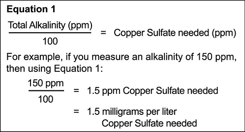 Introduction Copper has been used for many years as a chemical tool in freshwater farm ponds and aquaculture operations. It is both an effective algicide and a parasite treatment. The problem with the use of copper is that there is a thin line that separates effective treatment levels from overdoses, which can kill fish. This fact sheet is designed to explain when copper is used, how it is used, and some precautions to take before using it. Copper can be used to control algae in ponds, including filamentous and higher algae such as Chara ("Stink weed"). There have been some efforts to use copper to reduce the abundance of algae that cause off-flavor in catfish, but not enough is known yet to make any definite recommendations. Copper will also control most external parasites of fish, including "Ich" [see UF/IFAS Extension Circular 716, Introduction to Freshwater Fish Parasites and UF/IFAS Extension Circular 920 Ichthyophthirius multifiliis (White Spot) Infections in Fish]. Copper comes in several forms which can be used in water. The cheapest and most commonly used form is copper sulfate, which is available either as a crystal or a powder (often known as "Bluestone" or "Blue powder"). Copper sulfate is water soluble, and dissolves fairly easily when mixed with water. Several companies market copper in liquid and crystal forms. Before you use any form of copper treatment, you need to measure the total alkalinity of your water (NOT HARDNESS OR pH), since the toxicity of copper to fish increases as the total alkalinity decreases. A good rule of thumb is to divide the total alkalinity (in parts per million) by 100 to get the concentration of copper sulfate to use in parts per million (1 ppm = 1 milligram/liter) (see Equation 1 ).