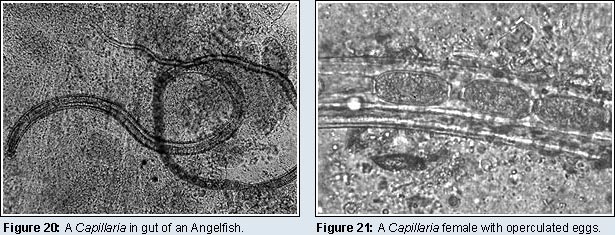 NEMATODES Nematodes, also called roundworms, occur worldwide in all animals. They can infect all organs of the host, causing loss of function of the damaged area. Signs of nematodiasis include anemia, emaciation, unthriftiness and reduced vitality. Three common nematodes affecting fish are described. Camillanus Camillanus is easily recognized as a small thread-like worm protruding from the anus of the fish. Control of this nematode in non-food fish is with fenbendazole, a common antihelminthic. Fenbendazole can be mixed with fish food (using gelatin as a binder) at a rate of 0.25% for treatment. It should be fed for three days, and repeated in three weeks. Capillaria Capillaria is a large roundworm commonly found in the gut of angelfish ( Figure 20 ), often recognized by its double operculated eggs in the female worm ( Figure 21 ). Heavy infestations are associated with debilitated fish, but a few worms per fish may be benign. Fenbendazole is recommended for treatment (see above).