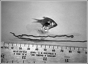 Because of the large size of the worms ( Figure 22 ), infected fish may appear unsuitable for retail sales. Protecting fish from wading birds and eliminating the intermediate host, the oligocheate or Tubifex (soft-bodied worms), are the best means to prevent infection. more ... |