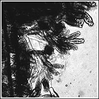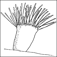 It is similar in appearance to Apiosoma except for the non-contractile long stalk ( Figure 8 ) and its ability to form colonies. In contrast to the other ciliates discussed above, the preferred treatment for Epistylis is salt. Fish can be placed into a 0.02% salt solution as an indefinite bath, or a 3% salt dip. More than one treatment may be required to control the problem. For more information, see IFAS Extension Fact Sheet VM-85 , "Red Sore Disease" in Game Fish . Capriniana Capriniana, historically called Trichophyra, is a sessile ciliate that attaches to the host's gills with a sucker. They have characteristic cilia attached to an amorphous-shaped body ( Figure 9 ). In heavy infestations, Capriniana can cause respiratory distress in the host. One treatment from a chemical listed in Table 1 should be adequate.