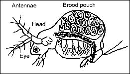 Daphnia are small freshwater crustaceans commonly called "water fleas". This common name is the result not only of their size, but their short, jerky hopping movement in water. The genera Daphnia and Moina are closely related cladocerans. They occur throughout the world and are collectively known as daphnia. Daphnia have a body consisting of a head and a trunk ( Figure 1 ). The antennae are the main means of locomotion. Large compound eyes lie under the skin on the sides of the head. One of the major characteristics of daphnia is that the main part of the body, the trunk, is enclosed in an external skeleton (carapace). Periodically, they molt or shed their external shell. The brood pouch, where the eggs and embryos develop, is on the dorsal side of the female. In Daphnia , the brood pouch is completely closed, while Moina have an open pouch.