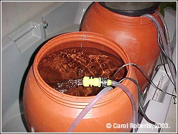 Description: A close up of my water aging barrels. See how the water cascades into the barrel. This releases CO2 from the water and stabilizes the pH.