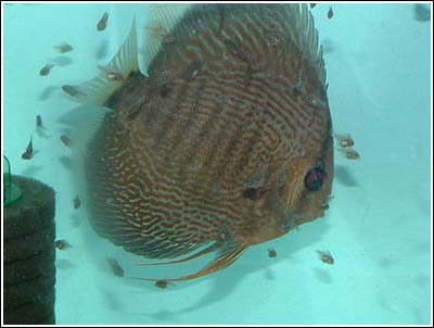 Ari: Watching my first pair spawning and raising babies.... That was just magic. I was home at the time... and I just sat in front of the tank and watched them for hours. Scott: It would have to be when our discus successfully raised their spawn from wrigglers to free-swimming fry. Before that, we just enjoyed the discus, and had no intention whatsoever of breeding them. It was too much like hard work I thought! But when we started to have pairs forming and spawning in the tank, we thought we'd take it to the next step and see what happened. Seeing my pet fish covered in clouds of fry was certainly a high point in my discus experience. JE: What is your most frustrating moment with discus? Ari: When fish refused to grow at all, and then stop eating... and get disease in the end. I really hate loosing fish, but I guess some fish are doing better than others, and some are growing better too. Scott: Which one - there have been many! If I had to pick one, it is having a discus runt out despite all my efforts to make him grow. If I buy half a dozen 1" fish, it is always the cleanest or the most interestingly patterned that refuses to grow. His tankmates double, then triple in size. So I'd isolate him and try metro to kill of internal parasites. Discus do best in groups, so I'd rearrange the stock in the tanks to put him with similar sized tank mates. Even then if he perks up and starts interacting, the damage is done, and he'll never grow as well as his siblings. Sometimes they are just a sickly fish that hang at the back during feeding, and slowly waste away. These are the most frustrating moments, but if his tank mates are fat and healthy, I just write him off as an under-achiever and leave him to his own devices. We probably have 5 or 6 fish like this that I'm hoping will recover and become fat, healthy albeit stunted and pointy adults. But I'm not holding my breath. JE: Do you have any future discus plans? Ari: Well....we get into discus because we love the fish, so I don't think we will be a big time breeder or anything like that. I would be happy to raise a spawn or two every now and then. But, most of the time, we just want to enjoy the fish. We still like travelling and being a big time breeder will stop us from doing our travelling. So, we try to get a balance there. But, we will always have discus, we can assure you that. This hobby will stick with you forever, I think, once you get into it..... Scott: Who doesn't?!! Like I said earlier, I'd love to concentrate on the white crosses and see if I can breed them into their own strain. That is a long way off though. I'd like to experiment with philodendrons as nitrate removers, and fluidised sand filters. I toyed with the idea of central filtration, but in the end decided it was just too complicated and too risky. I'll leave that to the commercial breeders. And then there's the kiddie pool growout idea from Cary, John and Beth, which I think is a great idea. An aquaculturist friend of mine has worked on barramundi farms in Far North Queensland, and there is an optimum stocking level for their ponds. They don't change water, and there are no plants in the ponds. During summer, it would be an easy way of growing fry out to a saleable size. I always say that if necessity was the mother of invention, laziness was the father... more... |