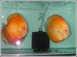 RK: My name is Roy Khoo and come from the sunny island of Singapore. I'll be turning 31 this year and currently attached with the love of my life Ai Tee. Apart from discus I keep Koi, parrots (2 african greys and a yellow nape amazon) and some flowerhorns. Other hobbies include playing tennis and scuba diving but have been really busy with discus after I started the hatchery 2 yrs ago. Currently, I'm into keeping marine fishes and live corals. I just wished discus were as vibrant in colors than marine fishes. JE: How did you get into discus? Where was the first discus you saw? How long had you been into fish first? RK: I started out the fish hobby when I was 11 and was successful in breeding and raising bettas and guppies. The discus hobby begun when I was 18, when my dad's friend gave him 8 2.5" Wattley turqs. Initially, for the first few months, he took care (feeding and doing water changes) of the fishes but he slowly assigned those tasks to me and I was hooked on the hobby big time. The "discus craze" was so bad that I visited most of the shops that sold discus in singapore and would end up buying fishes. This of course led to the addition of more and more tanks. Even till this day I will always remember the expression on my mom's face (Oh no, not more fishes Roy!) whenever I brought more fishes home. On numerous ocassions my dad would accompany me for discus hunting and I would have a field day with him being the paymaster. To think of it I really enjoyed that father-son bonding when we went out to look for fishes and i would like wise do so when i do have kids of my own. Whenever I knew there was a new discus book out in the stores ii was a must have and I would not take no for an answer. more... |