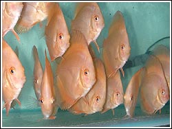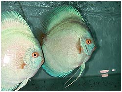 RK: Always breed healthy fishes. Regular feedings and water changes are the key to success for raising young fishes. Adults are fed about 2 times a day and young fish (anything between 1" - 4") are fed about 4-5 times a day. JE: What do you feed your discus? You must go through a ton of fish food! RK: We feed the fishes oxheart, bloodworms and brine shrimp. The bulk of the food we use is oxheart and the fishes chow down about 50 kg or more per month easily. JE: What is your most exhilarating moment with discus? RK: Whenever there is a new brood of fry on the way. Watching the parents care for their young is simply wonderful. JE: What is your most frustrating moment with discus? RK: The most frustrating moment is to see a pair do their dance rituals before spawning and when the female starts to lay her eggs the male is by her side doing nothing and acting dumb. more... |