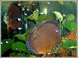 JD: Hello Everyone. First let me say it is a very big honor to be selected for the May member spotlight. Thank you! Now then, I am 40 years old, married, and have one daughter, a dog, and a cat. I live in Hillsboro Oregon, about 20 miles west of Portland. I am a native Oregonian, and can not foresee living anywhere else, as I love this part of the world. I have worked for the County Elections Department for the past 15 years, and find it a very enjoyable line of work. I am sure I will retire from there someday. My other hobbies include, time with family and friends, enjoying nature, weightlifting and keeping fit, music, and current events. JE: How did you get into discus? Where was the first discus you saw? How long had you been into fish first? JD: I started fish keeping in 1992 when my wife twisted my arm into buying a used 55 gallon tank and stand, with several large cichlids. As the story goes, she soon lost interest, and I was hooked! I saw my first discus in Tropical Fish Hobbyist magazine soon after getting into the hobby, but did not actually get any until 1996 when I bought 4 juvenile turquoise discus at the local fish store. JE: How did you decide to take the plunge into breeding as a professional endeavor? JD: Well, after having discus for several years, and enjoying them in a community tank setting, I decided to attempt to have them spawn for me, as it was considered a challenge in the fish keeping hobby. One correction would be that I am not a professional breeder in the sense that I do not make a living from discus. I would describe myself as a hobbyist breeder. After getting my first pair of discus, and after the first few spawns, it just came naturally to expand into several pairs. more... |
