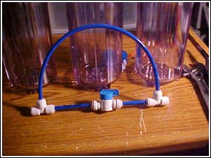 Here's a flow restrictor being installed in the flush assembly. Note the black "tail" goes in the direction of the water flow. Here's a finished flush assembly. It is a simple bypass valve. Turning the blue handle on the ball valve bypasses the flow restrictor that is in the arched tube. The faster flow of water carries away all contaminants on the surface of the membrane.